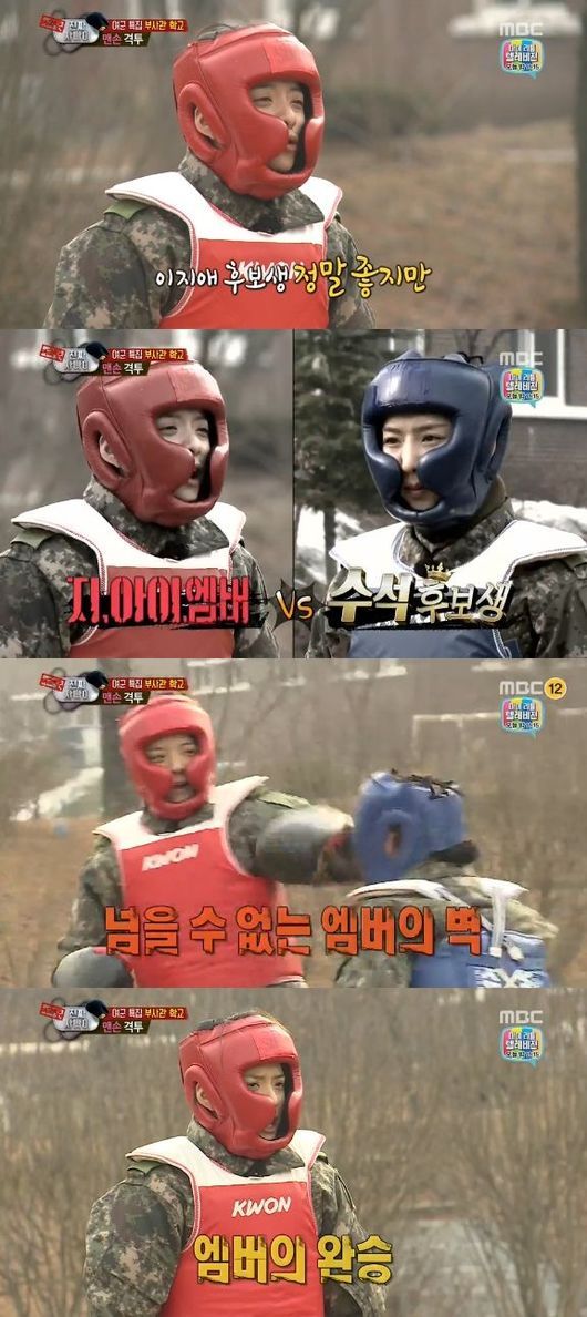 엠버는 22일 오후 방송된 MBC 예능프로그램 '일밤-진짜 사나이'에서 이지애와 대결, 전투기계의 면모를 드러내며 승리했다.