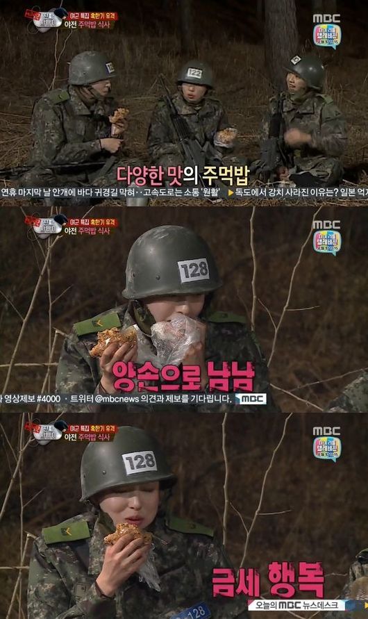이다희는 22일 오후 방송된 MBC 예능프로그램 '일밤-진짜 사나이'에서 저녁 식사로 지급받은 주먹밥을 양 손으로 들고 먹방을 선보였다.