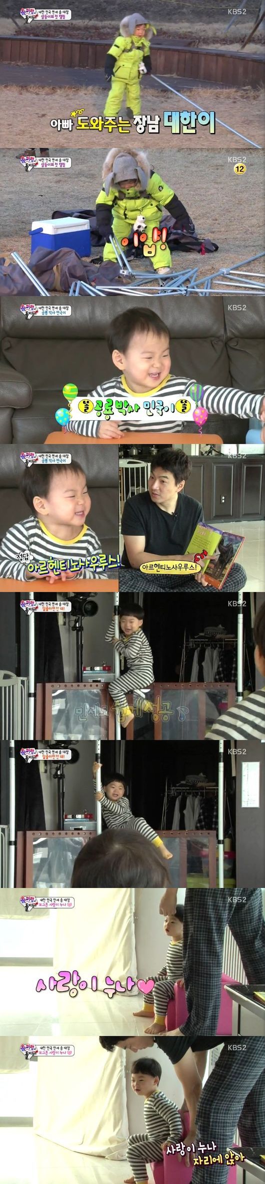 민국이, 만세와는 또 다르게 대한이는 아빠의 옆을 지키는 든든한 맏이의 면모로 성장을 보였다. 이날 송일국은 삼둥이와 함께 근처 캠핑장으로 캠핑을 간 상황. 보이 스카우트 경험이 있다지만 캠핑 초보나 다름이 없는 그는 처음부터 텐트를 치지 못해 쩔쩔 맸다. 그런 그를 돕기 위해 나선 것은 대한이었다.