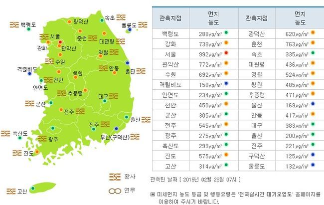 23일 오전 7시 현재 전국의 미세먼지 농도는 400~800㎍/㎥로 관측 되고 있다. 이 농도는 황사 경보가 발효 되기 바로 전 단계로 '짙은 황사'에 해당 된다.