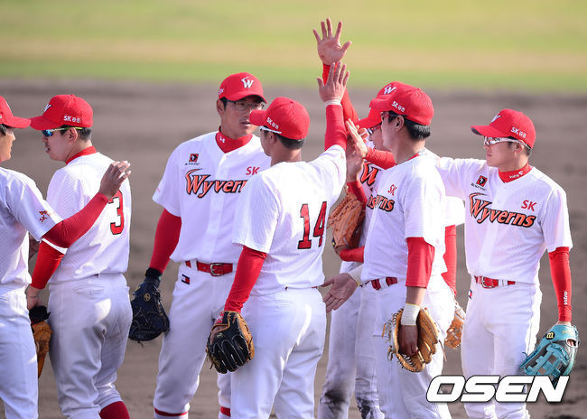 지난 17일 SK 와이번스가 한화 이글스와의 연습경기에서 승리를 거둔 뒤 기뻐하고 있다.