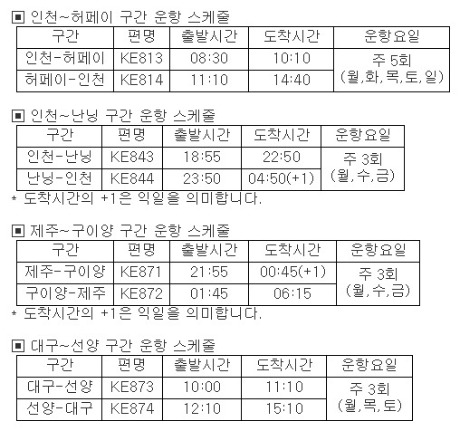 대한항공은 오는 3월 30일 인천~허페이, 5월 11일 인천~난닝, 제주~구이양, 6월 22일 대구~선양 노선을 각각 신규 취항한다.