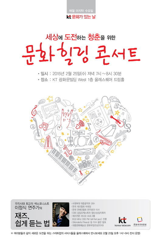 KT가 개최하는 첫 행사는 한국의 케니G라 불리는 재즈 색소포니스트 이정식이 들려주는 렉처 퍼포먼스(Lecture+Performance, 강연과 공연의 결합), '세상에 도전하는 청년을 위한 문화 힐링'으로, '재즈 쉽게 듣는 방법' 강의에 이어 우리 시대의 청춘들을 격려하는 메세지를 담은 연주를 선사할 예정이다.
