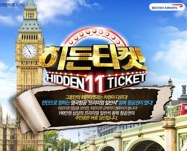 히든티켓 이벤트 참여방법은 이벤트 페이지에서 3개의 숫자 힌트를 참고하여 숨겨진 가격을 추측해 정확한 가격을 댓글로 작성하여 맞추면 된다. 정답에 가장 근접한 가격으로 응모한 단 1명에게 영국 항공의 190만 원대 런던행 왕복 항공권이 무료로 제공된다. 단, 정답자가 여러 명일 경우 가장 먼저 맞춘 사람에게 행운이 돌아간다.