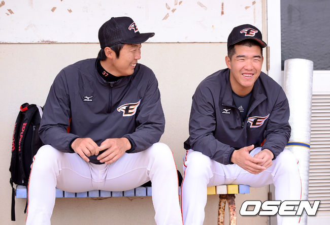 배영수와 22일 오키나와 캠프에 합류한 정근우가 재활 훈련에 앞서 이야기를 나누고 있다. 정근우는 지난 13일 일본 고치 하루노구장에서 열린 세이부 라이온즈와 연습경기 수비 도중 1루 주자의 헬멧을 스친 뒤 굴절된 공에 턱 부위를 맞아 하악골 골절 판정을 받았다.