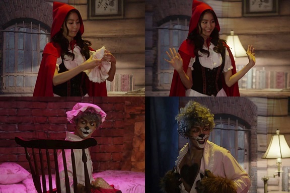 23일 tvN측이 공개한 사진에서 유이는 빨간 망토를 쓰고 동화 속 ‘빨간모자’로 변신해 사랑스러운 매력을 드러냈다. 사진 속 유이는 귀여운 표정부터 늑대를 보고 화들짝 놀란 표정까지 다양한 표정연기로 눈길을 끌고 있다. 빨간모자 유이에 이어 임슬옹은 사악하고 음흉한 늑대로 완벽 변신했다. 가슴에는 하트 모양의 털까지 부착한 임슬옹은 빨간 모자 유이에게 갖은 애교를 부리는 능글맞은 연기를 선보이며 웃음을 유발하고 있다.