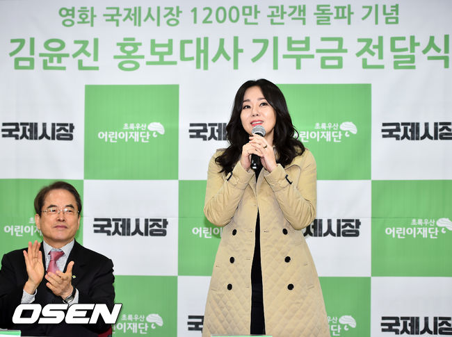 김윤진은 지난해 '국제시장'의 개봉을 앞두고 진행된 인터뷰에서 영화의 관객수가 1,200만을 넘어설 경우 초록우산어린이재단에 1,200만 원을 기부하겠다는 뜻을 밝힌 바 있다. 이후 지난달 25일 영화 ‘국제시장’의 누적 관객수가 1,200만을 돌파함에 따라 약속했던 기부 공약의 이행에 나선 것.