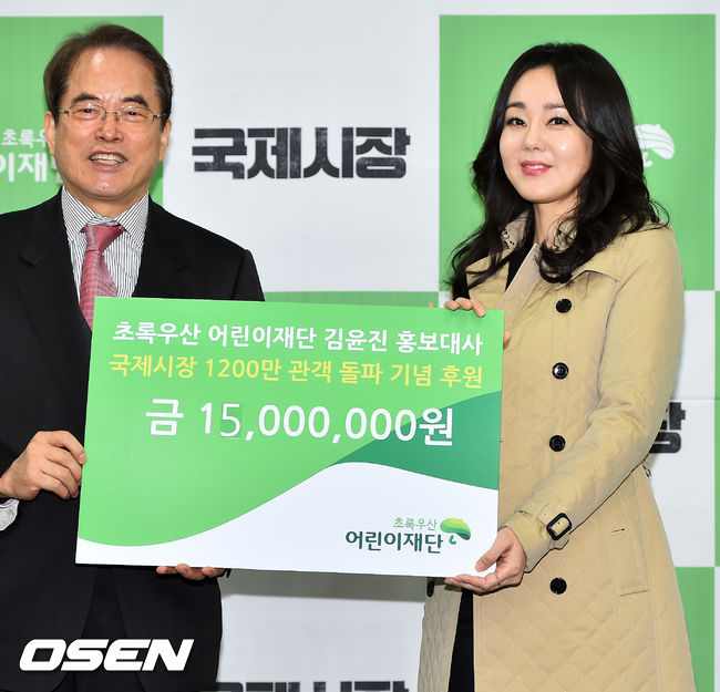 김윤진은 지난해 '국제시장'의 개봉을 앞두고 진행된 인터뷰에서 영화의 관객수가 1,200만을 넘어설 경우 초록우산어린이재단에 1,200만 원을 기부하겠다는 뜻을 밝힌 바 있다. 이후 지난달 25일 영화 ‘국제시장’의 누적 관객수가 1,200만을 돌파함에 따라 약속했던 기부 공약의 이행에 나선 것.