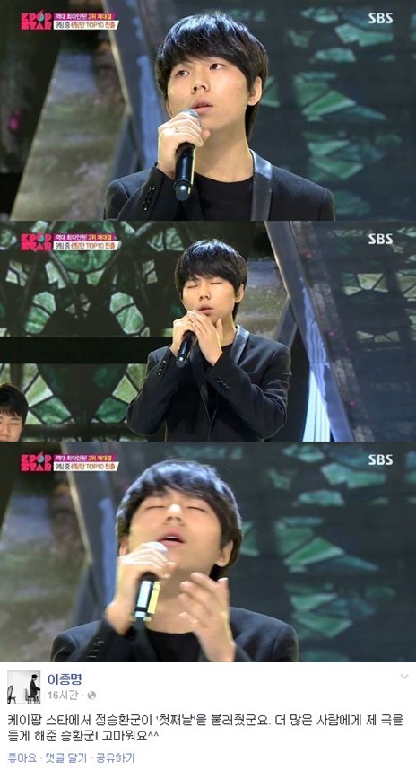 에코브릿지는 지난 22일 오후 자신의 페이스북을 통해 “‘케이팝 스타’에서 정승환군이 '첫째날'을 불러줬군요. 더 많은 사람에게 제 곡을 듣게 해준 승환군! 고마워요”라는 글을 게재하며 정승환에 감사인사를 전했다.