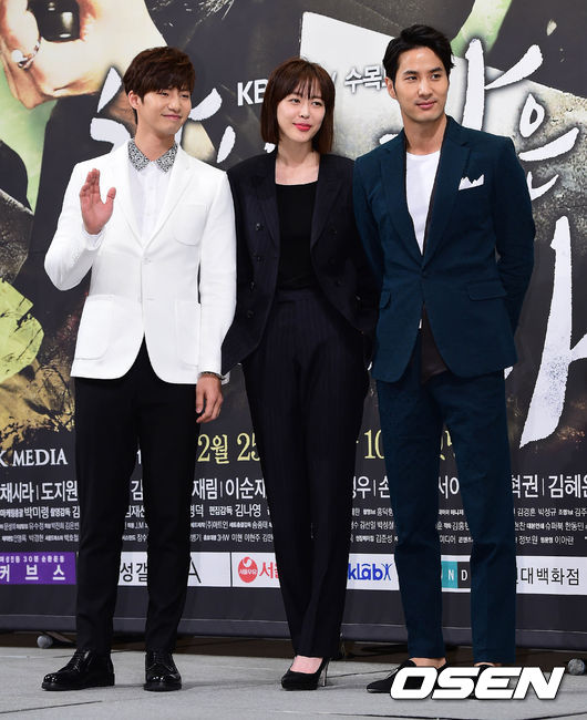 23일 오후 서울 임피리얼 팰리스 서울 호텔에서 열린 KBS '착하지 않은 여자들' 제작발표회에서 송재림, 김혜자, 김지석이 포토타임을 갖고 있다.