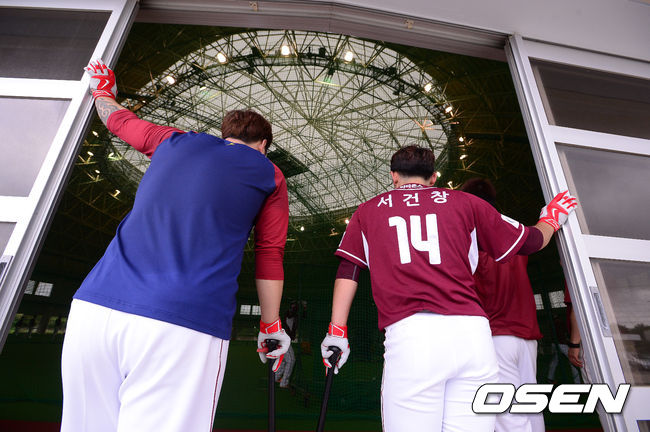 박병호, 서건창이 실내 훈련장에서 타격 훈련을 하며 순서를 기다리고 있다.