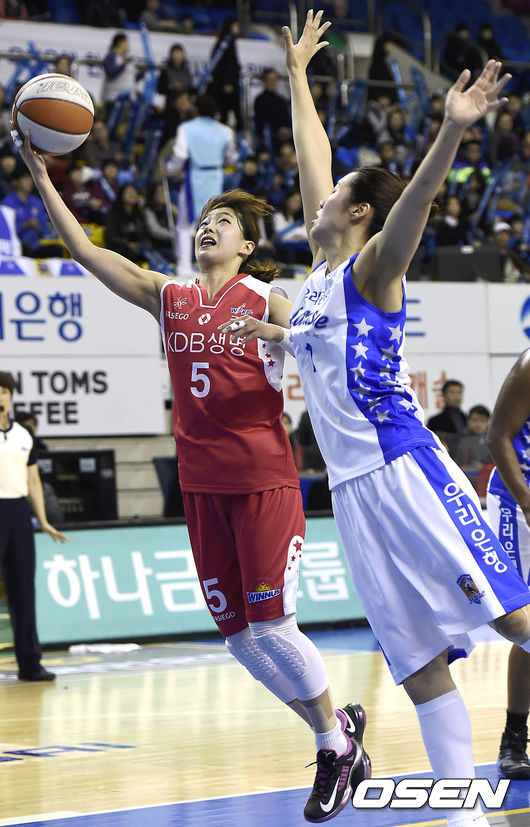 1쿼터 KDB생명 이경은이 우리은행 양지희의 수비를 피해 레이업슛을 성공시키고 있다.
