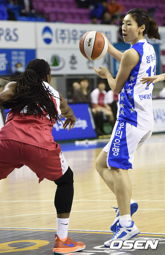 4쿼터 우리은행 임영희가 KDB생명 하지스의 수비를 피해 드리블하고 있다.