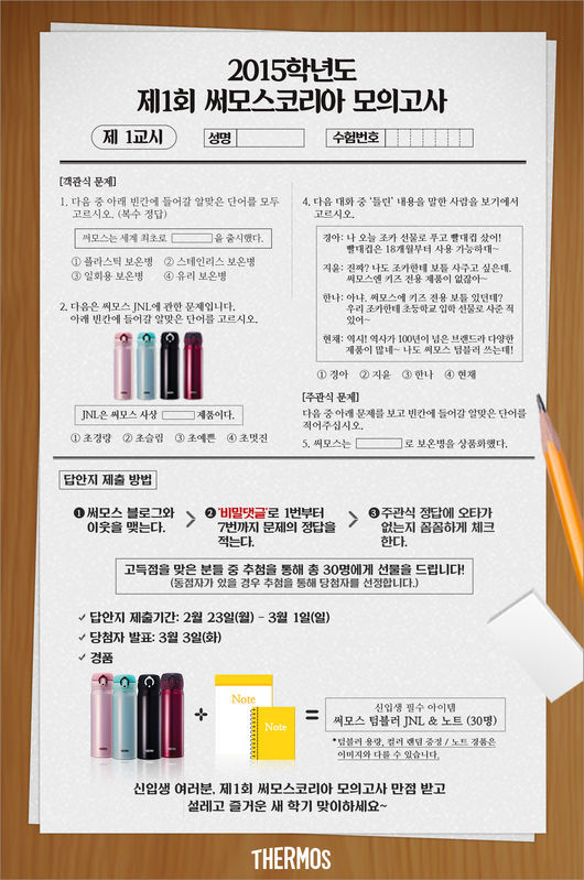 글로벌 보온병 브랜드 써모스코리아(대표 야마구치 히토시, www.thermos.kr)가 신학기를 맞이해 '2015학년도 제 1회 써모스코리아 모의고사' 이벤트를 23일부터 3월 1일까지 실시한다.