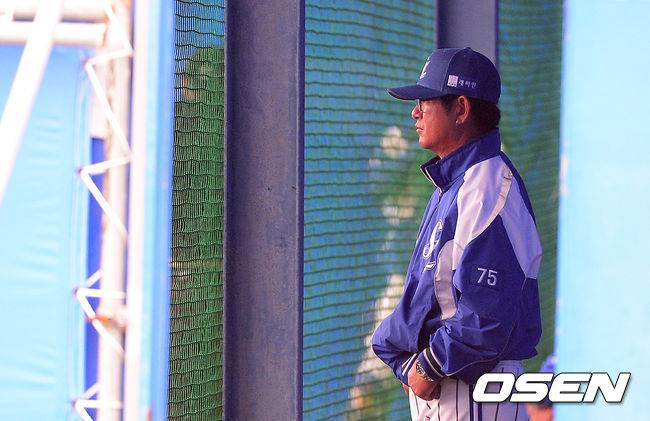 경기에 앞서 삼성 류중일 감독이 불펜에서 투수들의 피칭을 지켜보고 있다.