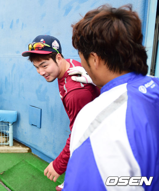 경기에 앞서 넥센 박병호와 삼성 박석민이 인사를 나누고 있다.
