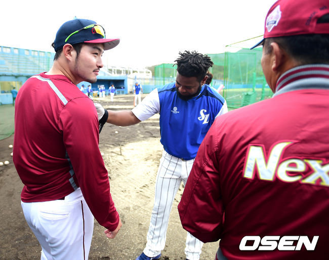 경기에 앞서 넥센 박병호와 삼성 나바로가 인사를 나누고 있다.