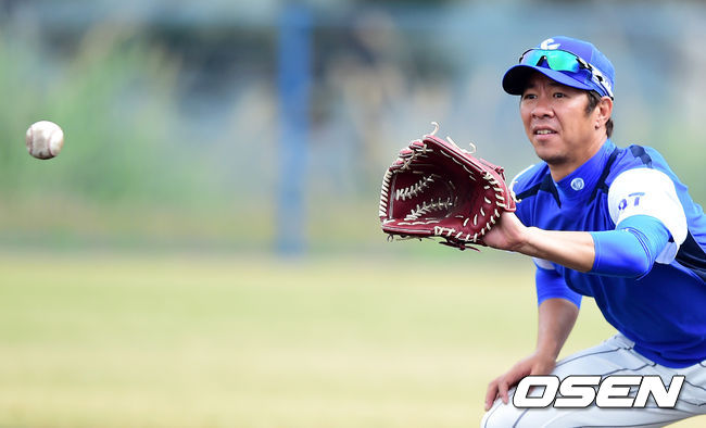 경기에 앞서 삼성 임창용이 수비훈련을 하고 있다.