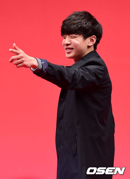 24일 오전 서울 중구 웨스틴 조선호텔에서 진행된 '제 20회 코카콜라 체육대상'에서 신인상을 수상한 사격 김청용이 평소에 좋아하는 손연재를 향한 세리머니를 하고 있다.