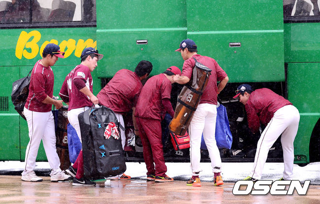 넥센 선수들이 비를 피해 재빨리 버스에 오르고 있다.