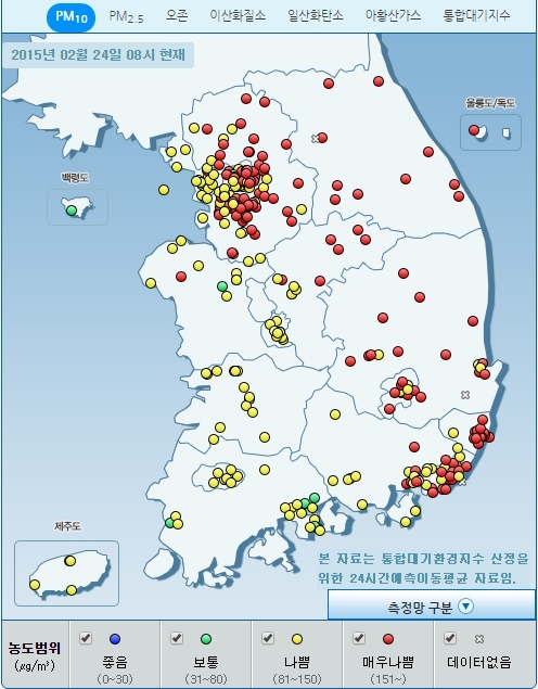 24일 에어코리아에 의하면, 황사의 영향으로 전 권역이 '나쁨'으로 예상됐다. 다만, 경기북부, 강원권, 영남권의 경우 낮까지 '매우나쁨' 수준의 농도가 나타날 수 있다.