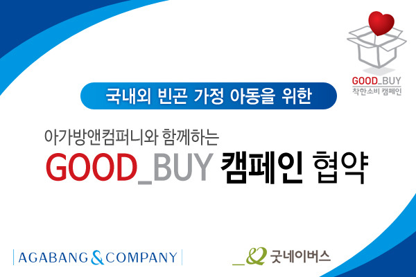 유아동복·용품 전문기업 아가방앤컴퍼니(대표이사 이원재)는 국제 구호 개발 NGO단체인 굿네이버스(회장 이일하)와 협약을 맺고 '아가방앤컴퍼니와 함께하는 굿바이(GOOD_BUY) 캠페인'을 실시한다.