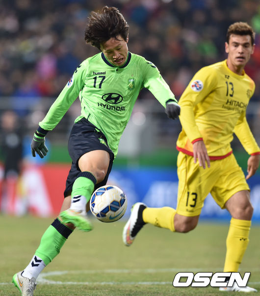 24일 오후 전주월드컵경기장서 열린 아시아축구연맹(AFC) 챔피언스리그 조별리그 E조 1차전 전북 현대(한국)와 가시와 레이솔(일본)의 경기,전반 전북 이재성이 크로스바 맞추는 슈팅을 시도하고 있다.