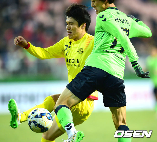 24일 오후 전주월드컵경기장서 열린 아시아축구연맹(AFC) 챔피언스리그 조별리그 E조 1차전 전북 현대(한국)와 가시와 레이솔(일본)의 경기,후반 가시와 김창수가 전북 이재성의 슛을 온몸으로 막아내고 있다
