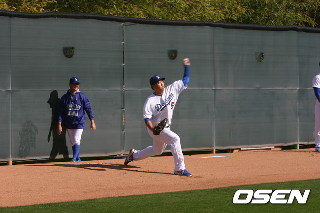 LA 다저스 류현진이 25일 자신의 두 번째 불펜 피칭에 임하고 있다.