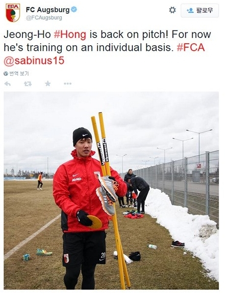 아우크스부르크는 24일(한국시간) 팀 공식 SNS를 통해 "홍정호가 훈련에 복귀했다. 개인훈련을 통해 컨디션을 끌어 올릴 예정"이라면서 "팀 훈련에 공식적으로 복귀한 것은 아니지만 재활훈련이 그라운드에서 열릴 예정"이라고 밝혔다.