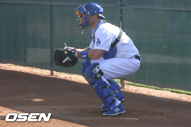 25일(한국시간)류현진의 두 번째 불펜 피칭을 받고 있는 LA 다저스 포수 A.J.엘리스
