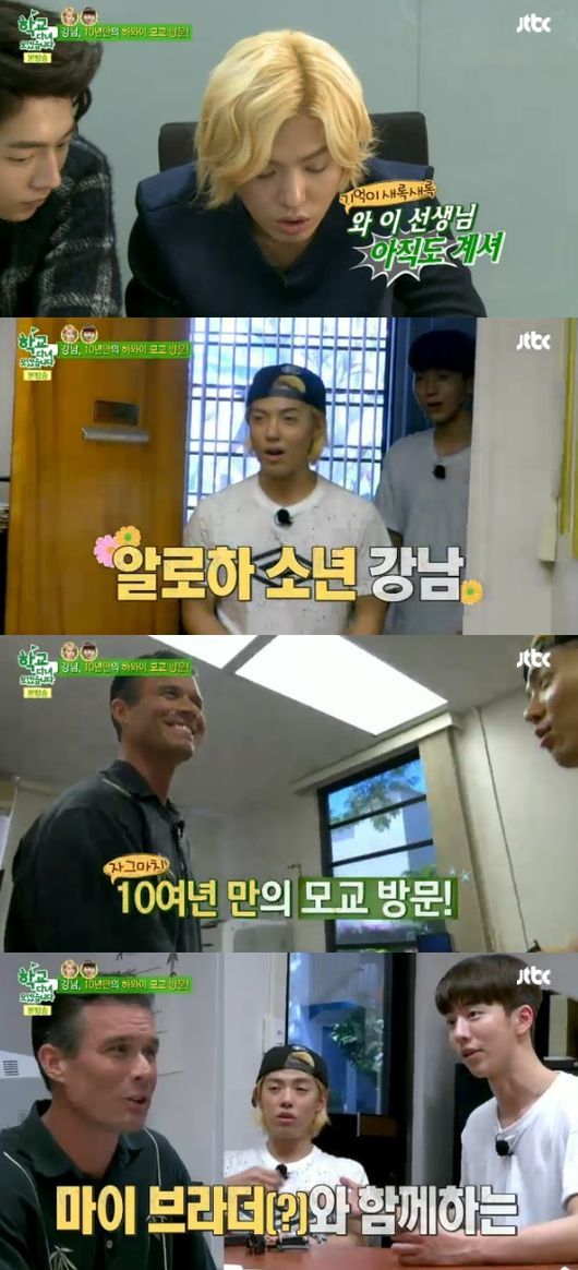 이어 “강남이 성공해서 돌아온 것 같은 모습을 보였고 모범생에 빙의해서 열심히 수업을 받았다. 한국 학교에서와는 전혀 다른 모습을 보여줬다”고 전했다.