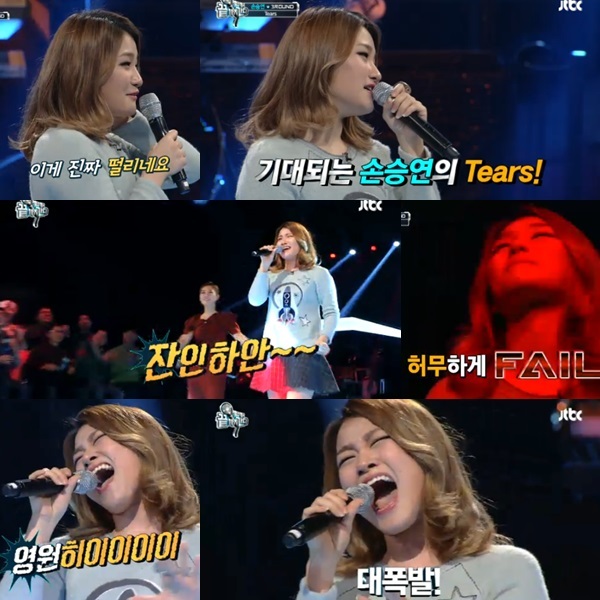 노래가 시작되자 손승연은 기대했던 대로 ‘티어스’를 부르기 시작했고 여유 있는 모습에 성공할 거라 예상했지만 섞여 있는 가사가 나타나자 바로 실패했고 손승연도 아쉬운지 무반주에서 노래를 불렀다. 이에 MC들이 스폐셜 무대를 제안했고 손승연은 부담감을 덜어놓고 ‘티어스’를 불렀다. 손승연은 보는 이의 가슴을 뻥 뚫어 줄 만큼 특유의 시원시원한 가창력과 고음으로 ‘티어스’를 소화해 환호를 받았다. 손승연표 ‘티어스’가 탄생한 순간이었다.