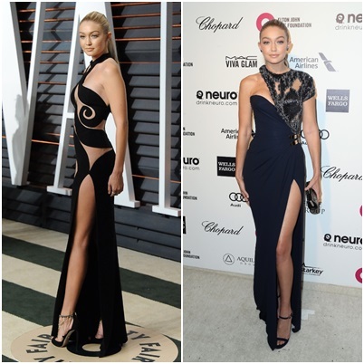 모델 지지 하디드는 캡슬리브와 골드 버클 디테일의 다크 블루 아틀리에 베르사체 드레스로 강렬한 카리스마를 뽐냈다. 이후에는 블랙 SS15 아틀리에 베르사체 컷아웃 드레스로 갈아입고 완벽한 몸매를 과시했다.