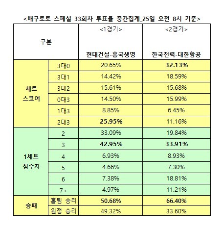 대한항공의 승리 예상은 33.60%로 나타났고, 최종 세트스코어에서는 3-0 한국전력 승리(32.13%) 예상이 가장 높게 나타났다. 또 1세트 점수차 예상에서는 3점차(33.91%)가 1순위로 집계됐다.