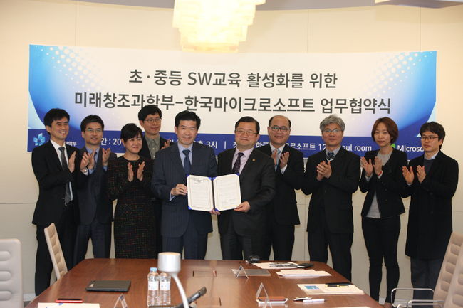 미래창조과학부와 한국마이크로소프트는 25일 서울 광화문 한국마이크로소프트 사옥에서 '초·중등 소프트웨어(이하 SW) 교육 활성화를 위한 업무협약(MOU)'을 체결했다고 밝혔다.