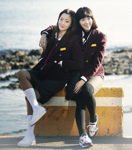 김희선은 '앵그리맘'에서 학교폭력에 시달리는 여고생 딸을 지키기 위해 다시 고등학교에 입학하는 30대의 젊은 엄마 조강자 역을 맡았다. 오윤아는 조강자의 여고 동창 주애연 역으로, 해당 사진은 두 사람의 고교시절 회상 장면을 촬영하던 중 찍은 사진이다.