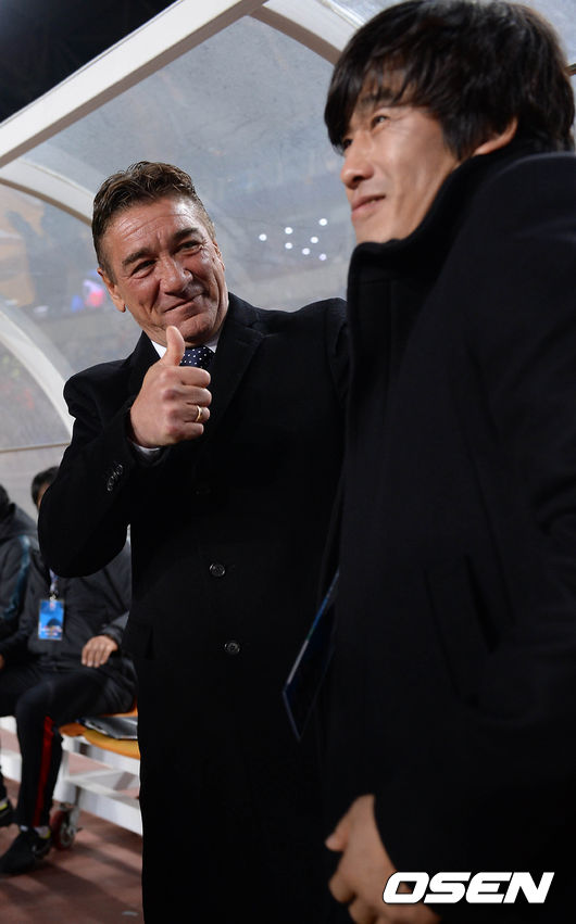 25일 오후 경기도 수원월드컵경기장에서 열린 아시아축구연맹(AFC) 챔피언스 조별리그 G조 1차전 수원삼성과 우라와 레즈(일본)의 경기, 경기시작전 우라와 페트로비치 감독과 서정원 감독이 인사를 나누고 있다.