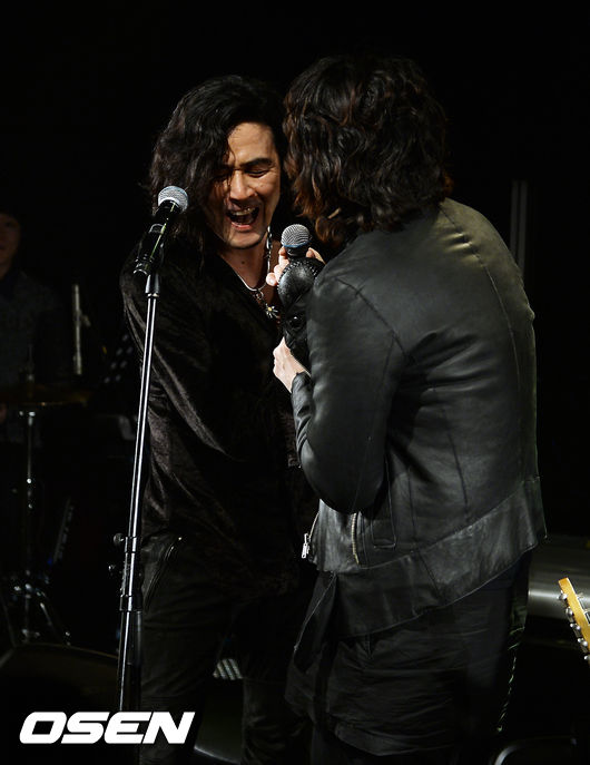 25일 오후 서울 종로구 홍익아트센터 소극장에서 진행된 가수 김장훈과 배우 최민수의 콜라보 공연에서, 김장훈과 최민수가 함께 열창을 하며 장난을 치고 있다.