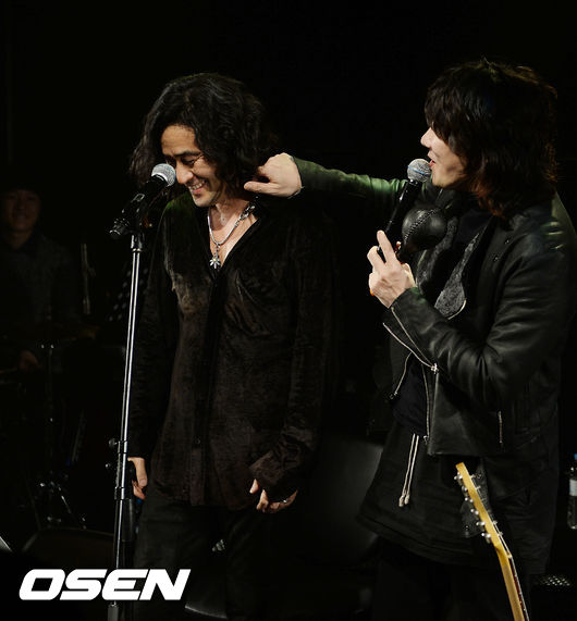 25일 오후 서울 종로구 홍익아트센터 소극장에서 진행된 가수 김장훈과 배우 최민수의 콜라보 공연에서, 김장훈과 최민수가 함께 열창을 한후 장난을 치고 있다.
