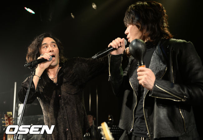 25일 오후 서울 종로구 홍익아트센터 소극장에서 진행된 가수 김장훈과 배우 최민수의 콜라보 공연에서, 김장훈과 최민수가 함께 열창을 하고 있다.