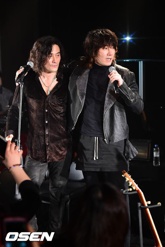 25일 오후 서울 종로구 홍익아트센터 소극장에서 진행된 가수 김장훈과 배우 최민수의 콜라보 공연에서, 김장훈과 최민수가 함께 열창을 한 후 관객과 얘기를 나누고 있다.