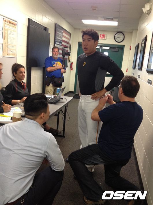 배번 27번을 받은 강정호도 사이즈 측정에 나섰다. 아무래도 연습복의 경우 사이즈가 100% 맞지 않아도 큰 문제가 없다. 하지만 실제 경기에 입고 뛰는 공식유니폼의 경우 착용감에 민감할 수밖에 없었다.