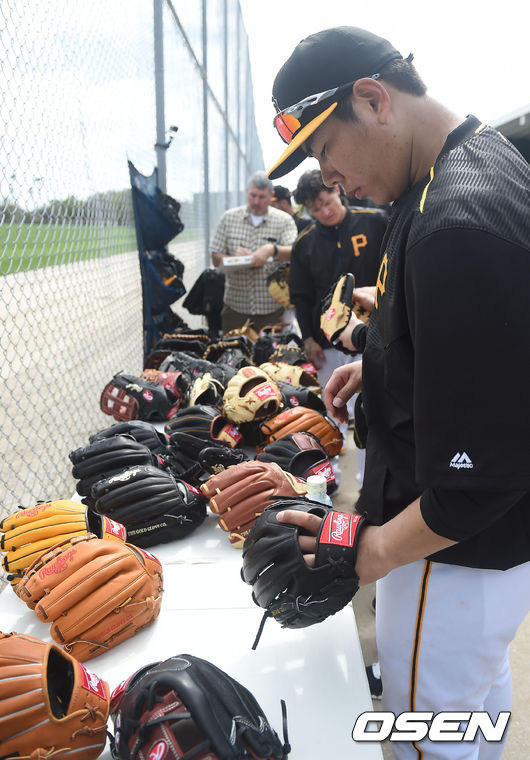 훈련을 마친 강정호가 새 글러브를 고르고 있다.
