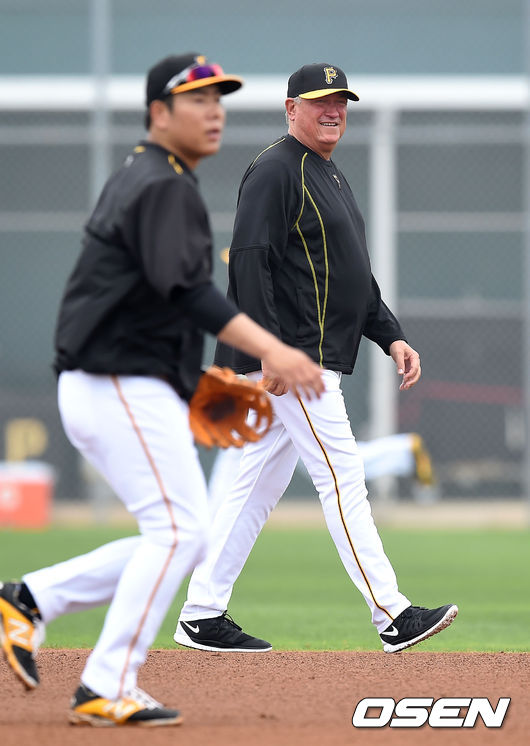 클린트 허들 감독이 강정호의 수비를 지켜보고 있다.