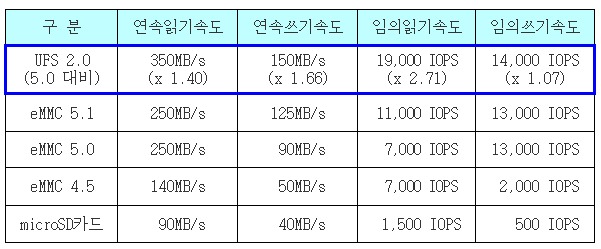 'UFS'는 국제 반도체 표준화 기구 '제덱(JEDEC)'의 최신 내장 메모리 규격인 'UFS 2.0' 인터페이스를 적용한 제품으로 시스템 성능에 큰 영향을 미치는 임의읽기 속도가 외장형 고속메모리 카드보다 12배 이상 빠르다.