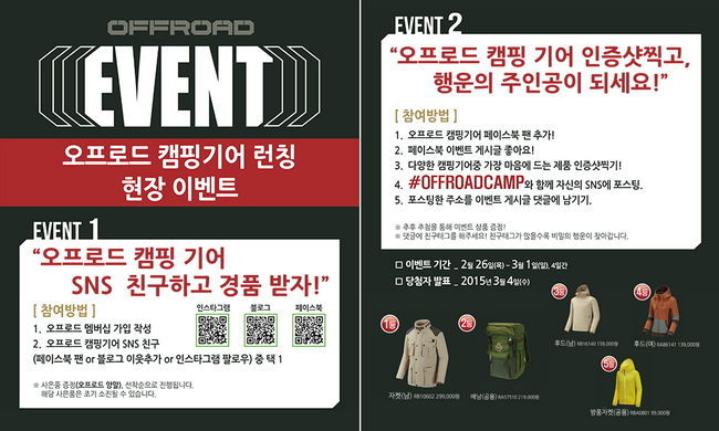 현장 이벤트 참여방법은 국제캠핑페어 박람회장의 오프로드 부스에 방문해 멤버십 가입 후 오프로드 캠핑기어의 페이스북(www.facebook.com/offroadcampkr)이나 블로그(blog.naver.com/offroadcamp), 인스타그램(@offroadcamp_insta) 중 하나를 선택하여 팬을 추가하거나 친구맺기를 하면된다. 이벤트 참여자 모두에게는 현장에서 선착순으로 사은품 양말을 증정한다.