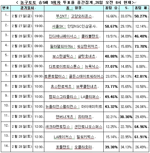 국민체육진흥공단(www.kspo.or.kr)이 발행하는 체육진흥투표권 수탁사업자인 스포츠토토 공식 온라인 발매사이트인 베트맨(www.betman.co.kr)이 오는 27일과 28일에 열리는 미국프로농구(NBA) 12경기와 국내프로농구(KBL) 2경기를 대상으로 한 농구토토 승5패 9회차 투표율을 중간 집계한 결과, 포틀랜드-오클라호마(6경기)전에서 홈팀 포틀랜드의 근소한 우세를 예상한 팬이 많았다고 밝혔다.