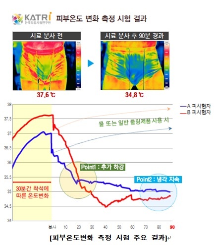 한국의류시험연구원에서 실시된 피부온도변화 측정 시험은 인체에서 가장 빨리 온도가 상승하고 높은 온도가 지속적으로 유지되는 남성 고환 부위를 대상으로 행해졌다. 즉, 피시험자의 고환에 온도센서를 부착하고 속옷과 하의를 입은 뒤 30분간 앉은 자세로 온도 변화를 측정하고, 그 후 제품을 시험 대상 부위에 분사한 뒤 매 10분마다 온도 변화를 체크하는 방식으로 진행되었다.