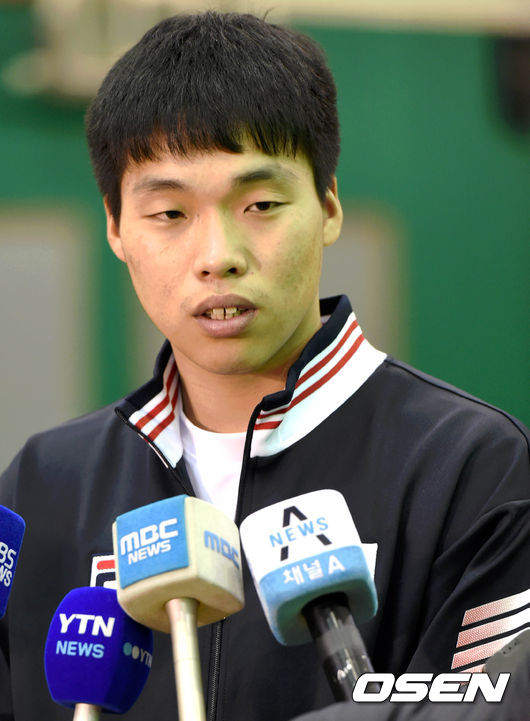 26일 오후 강원도 삼척시 삼척고등학교에서 열린 핸드볼 국가대표 남자 대표팀 첫 촌외훈련에서, 경기종료후 박재용이 인터뷰에 임하고 있다.